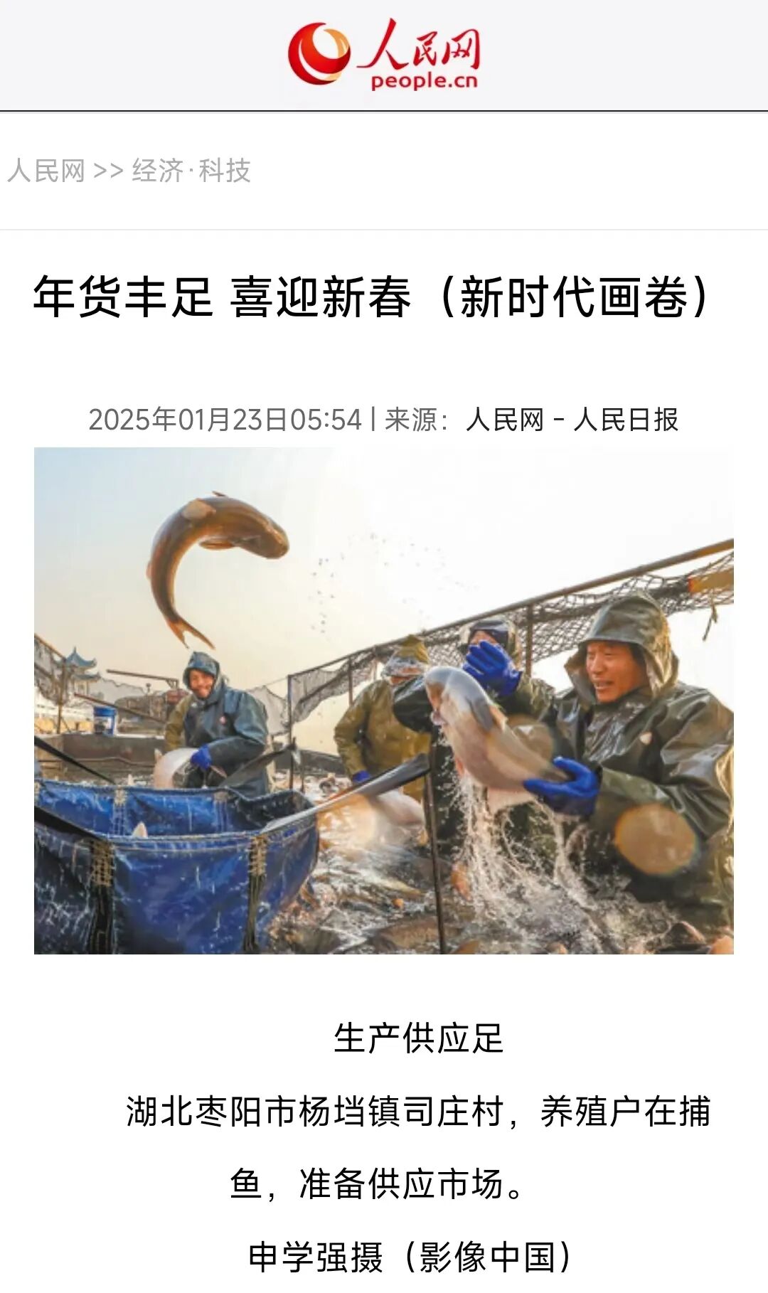 1月23日,人民日报图文推出《年货丰足 喜迎新春》,展现枣阳市杨垱镇司庄村养殖户捕鱼生产供应足的场景。